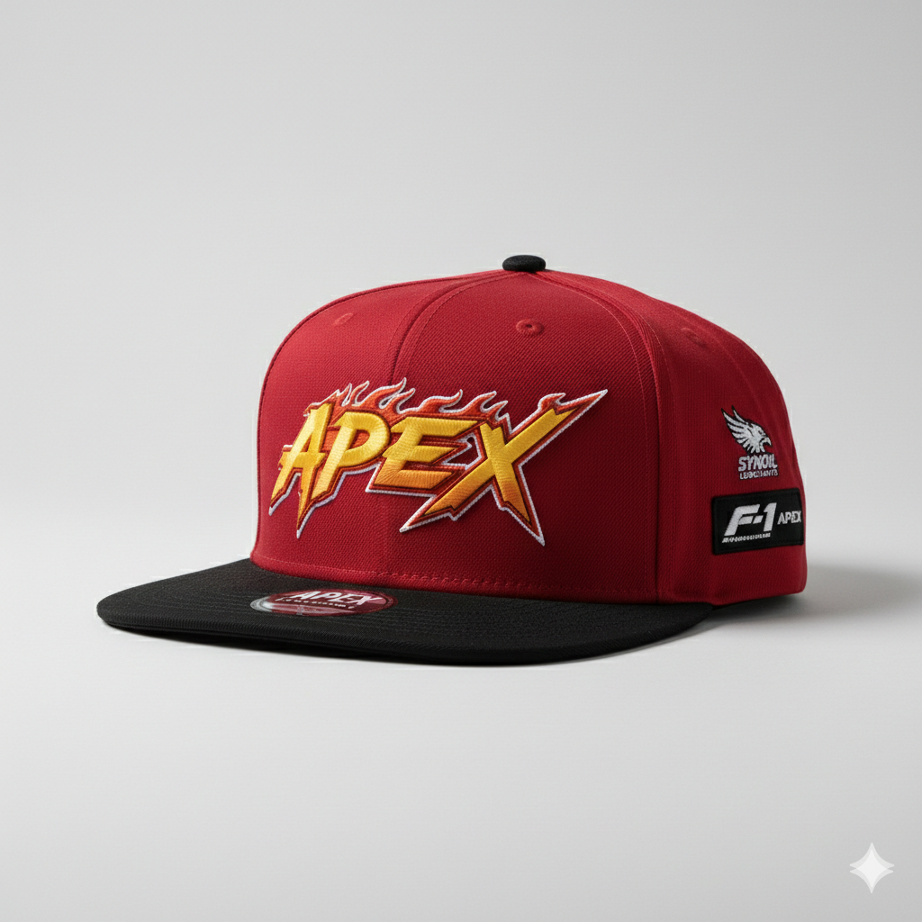 Bordados de Alta Definición: El logo APEX destaca en relieve 3D frontal, acompañado de parches laterales inspirados en la iconografía técnica del motorsport.
